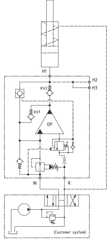 The basic operation is illustrated in the function diagram. Oil is fed through the directional valve (in the customer system) to the IN port, flowing freely through the PRV (pos. 5) and the internal check valves to the high-pressure side H. In this condition maximum flow through the booster is achieved giving a fast-forward function. When pump pressure is reached on the high-pressure side H, the internal check valves will close. The end pressure will be achieved by the oscillating pump unit OP. The unit will automatically stall when end pressure on the high-pressure side H is reached. If a pressure drop on the high-pressure side exists due to consumption or leakage, the OP valve will automatically operate to maintain the end pressure.