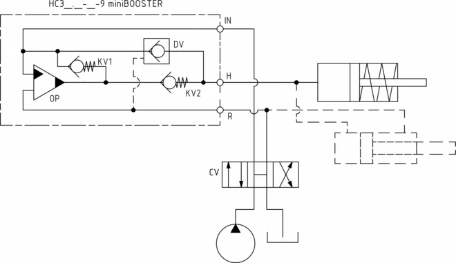 The basic operation is illustrated in the function diagram. The oil is fed through the connecting plate to the control valve to the IN port of the HC3 flowing freely through check valves KV1, KV2 and DV to the high pressure side H. From the high pressure side H oil is fed to port A on the connecting plate. In this condition maximum flow through the booster is achieved giving a fast forward function. When pump pressure is reached on the high pressure side H, valves KV1, KV2 and DV will close. The end pressure will be achieved by the oscillating pump unit OP. The unit will automatically stall when end pressure on high pressure side is reached. If there is a pressure drop on the high pressure side due to consumption or leakage, the OP valve will automatically operate to maintain the end pressure.