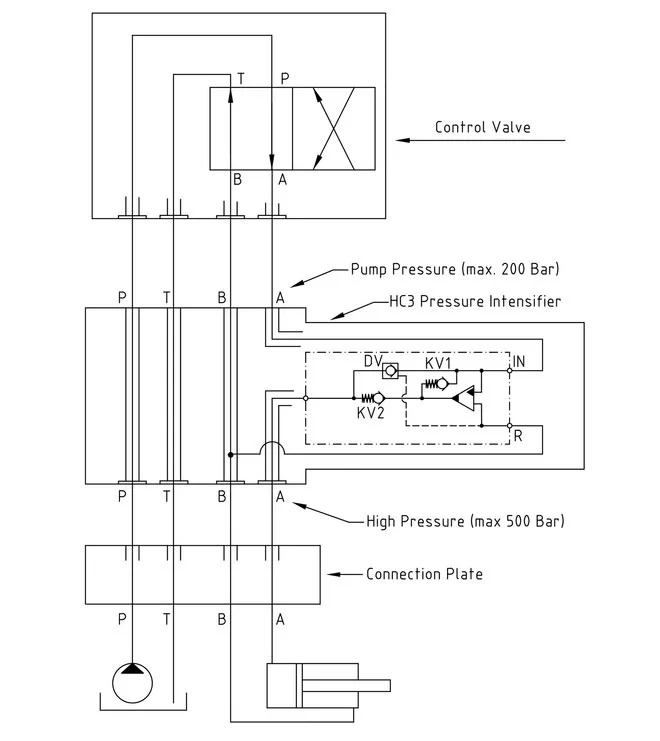 The basic operation is illustrated in the function diagram. The oil is fed through the connecting plate to the control valve to the IN port of the HC3 flowing freely through check valves KV1, KV2 and DV to the high pressure side H. From the high pressure side H oil is fed to port A on the connecting plate. In this condition maximum flow through the booster is achieved giving a fast forward function. When pump pressure is reached on the high pressure side H, valves KV1, KV2 and DV will close. The end pressure will be achieved by the oscillating pump unit OP. The unit will automatically stall when end pressure on high pressure side is reached. If there is a pressure drop on the high pressure side due to consumption or leakage, the OP valve will automatically operate to maintain the end pressure.