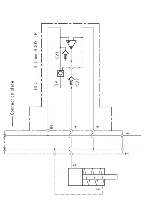 The basic operation is illustrated in the function diagram. Oil is fed through the directional valve CV to the IN port, flowing freely through the check valves KV1, KV2 and DV to the high-pressure side H. In this condition maximum flow through the booster is achieved giving a fast-forward function.