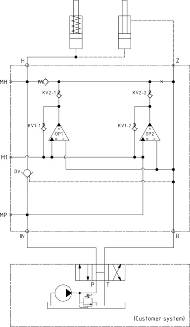 Experience efficient hydraulic operation with our directional valve system. Oil is efficiently directed through the CV valve to the IN port, seamlessly flowing through check valves KV1, KV2, and DV to the high-pressure side H. Enjoy maximum flow through the booster for rapid forward function. Once pump pressure is attained on the high-pressure side, valves KV1, KV2, and DV close, and the oscillating pump unit OP takes over to maintain end pressure automatically. Even in cases of pressure drops due to consumption or leakage, the OP valve adjusts to ensure consistent end pressure. Discover reliable hydraulic performance with our innovative system.
