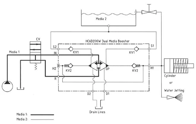 The system operates as follows: Media 1 enters through the IN port, flowing freely through bistable valve BV1 to drive the LP pistons. Simultaneously, Media 2 is drawn through check valves KV1, then pumped via KV2 to the high-pressure side H. This setup maximizes flow through the booster, enabling a fast-forward function. Automatic stall occurs when the end pressure on side H is reached. Should a pressure drop occur due to consumption or leakage, HP1 and HP2 units activate automatically to maintain end pressure.